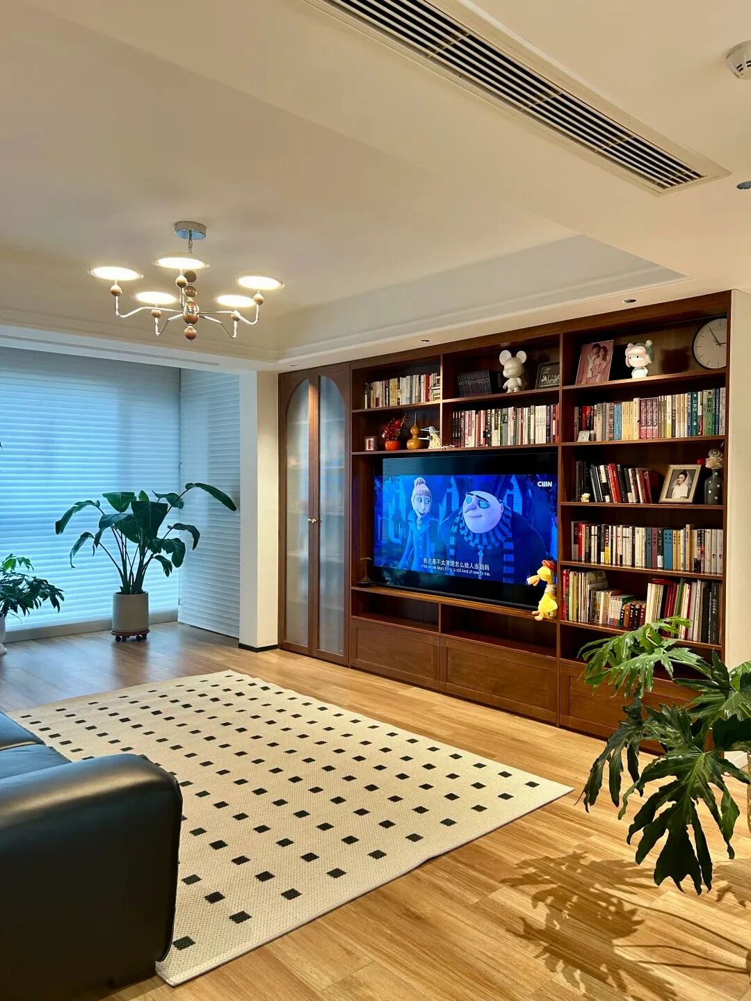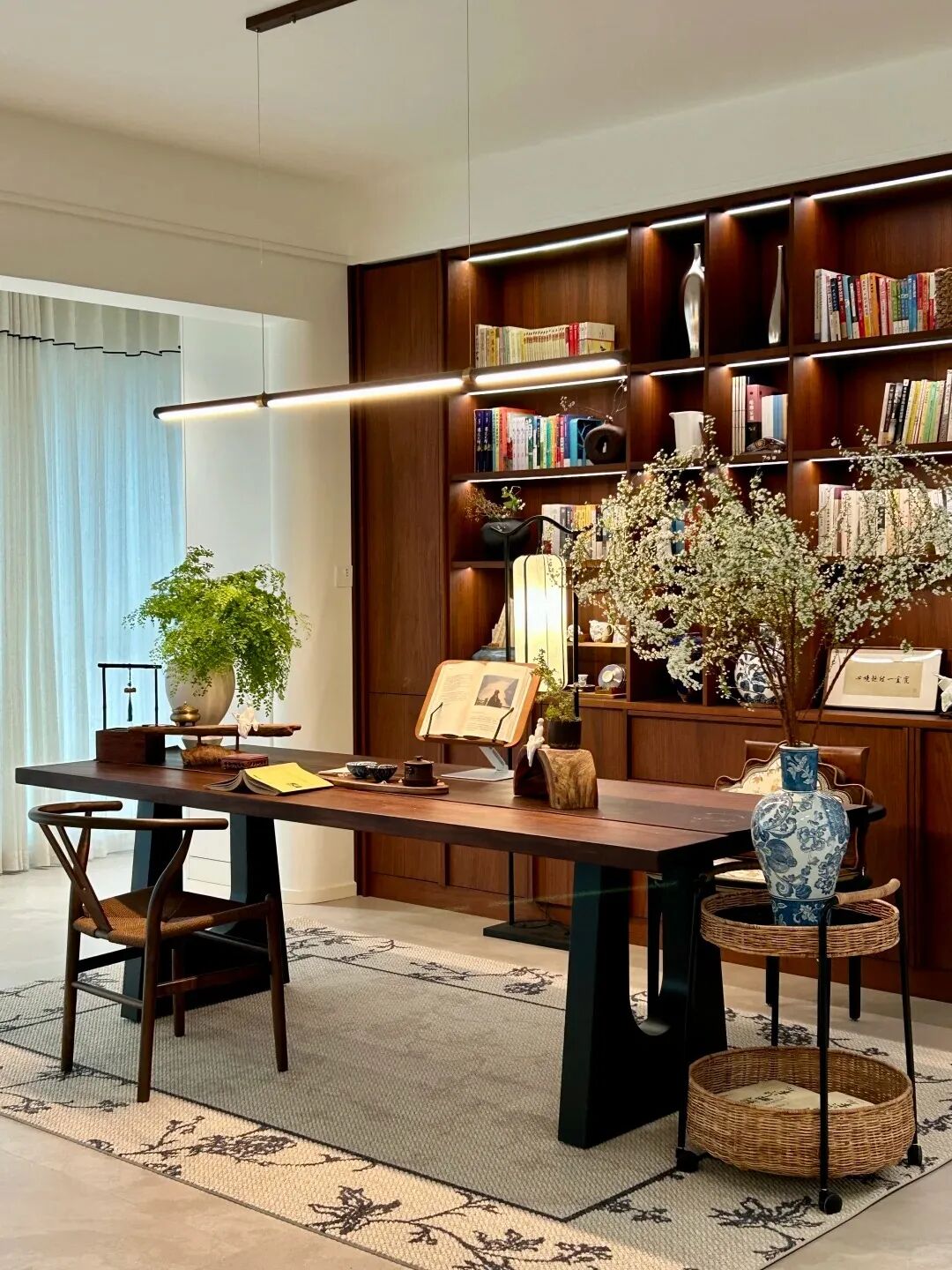 “书房+客厅+茶室”融合:开放式书柜,定制长桌,一侧放书,一侧摆茶具,朋友来访可边品茶边聊书。